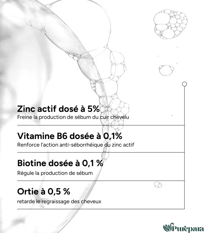 Zinc actif dosé à 5 % : freine la production de sébum du cuir chevelu