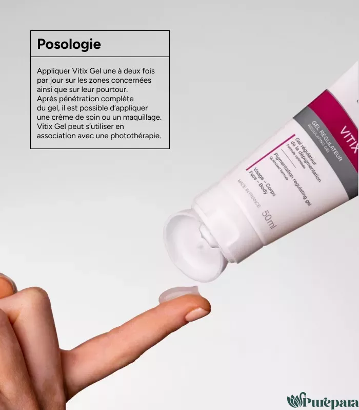 Le gel régulateur de la dépigmentation Vitix s’applique 1 à 2 fois par jour sur les zones dépigmentées, ainsi que sur leur pourtour, sur une période de 4 à 6 mois. Il peut être utilisé en complément de la photothérapie UVB pour améliorer ses résultats de repigmentation de la peau.