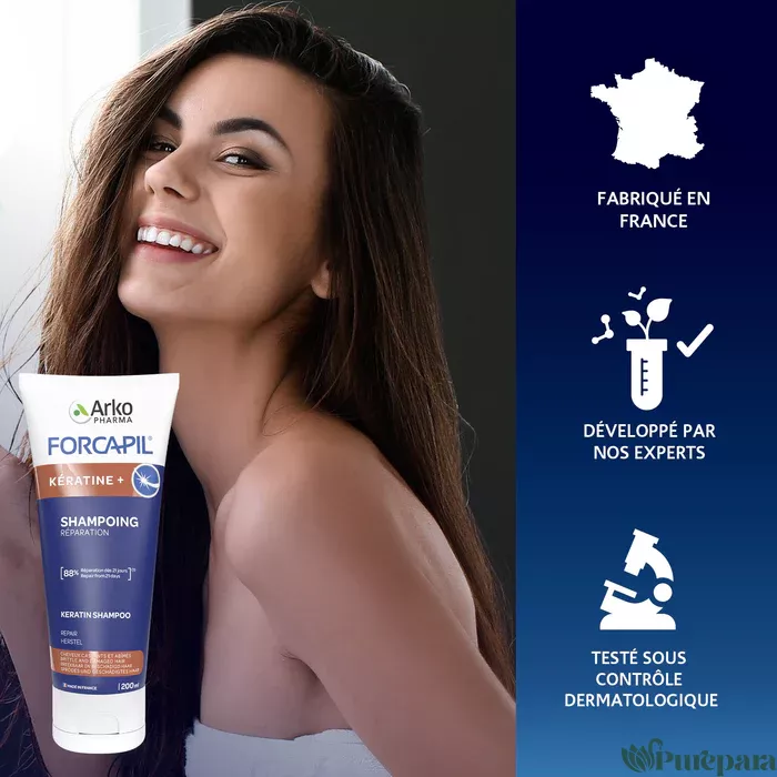 FORCAPIL KÉRATINE + SHAMPOING, expert de la force et de la santé du cheveu, riche en Provitamine B5 et Kératine, pour apporter force, vitalité et protection à la fibre capillaire de la racine à la pointe.