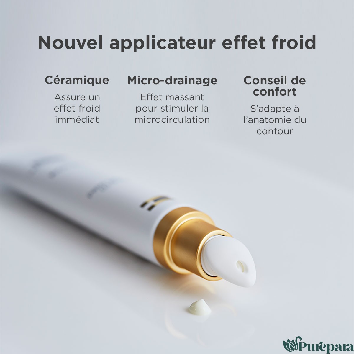 Crème contour des yeux indiquée pour le soin spécifique des poches et des cernes. Ce soin réduit les poches, éclaircit les cernes et illumine la zone du contour des yeux grâce aux principes actifs de la Vitamine K Oxyde et de l’acide hyaluronique. Son applicateur céramique assure un effet froid immédiat et massant qui stimule la micro-circulation. Résultats visibles en 28 jours seulement.