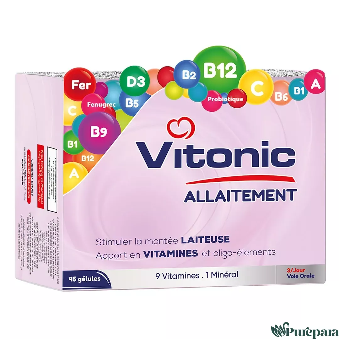 3 gélules de VITONIC ALLAITEMENTpar jour à avaler de préférence, au moment des repas avec un verre d’eau , ce produit contient spécifiquement un extrait de Galéga officinal aux propriétés galactogènes